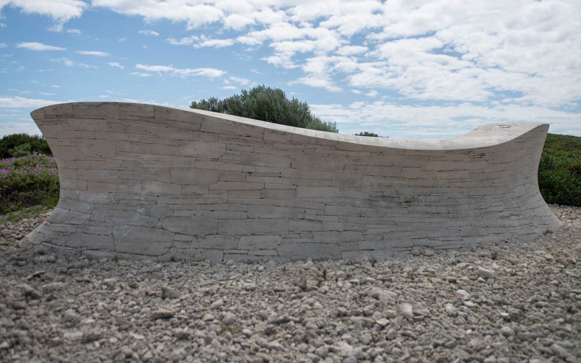 Inspired by the ocean and carved from local limestone, this bold piece marks the entry to Surfers Point.